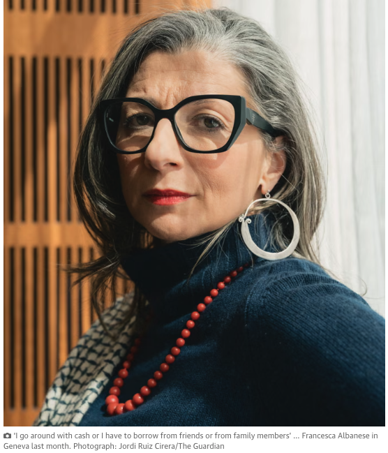 Albanese, lat 49, ostatnio spotyka się z podobnymi powitaniami gwiazd rocka wszędzie, gdzie się pojawia, co nie jest normą wśród nieopłacanych ekspertów prawnych ONZ. W innych czasach jej stanowisko – specjalny sprawozdawca ONZ ds. praw człowieka na terytoriach palestyńskich okupowanych od 1967 roku – brzmiałoby jak przepis na zapomnienie. Jest jedną z ponad 40 specjalnych sprawozdawców i ekspertów ds. praw człowieka powołanych do prowadzenia dochodzeń pro bono oraz raportów dotyczących obszarów budzących niepokój.