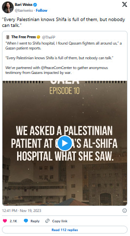 "Każdy Palestyńczyk wie, że [szpital al-Shifa] jest pełen [uzbrojonych bojowników], ale nikt nie może rozmawiać" – napisała na Twitterze, odnosząc się do wywiadu z Free Press, który rzekomo przeprowadzono z anonimowym mieszkańcem Gazy.