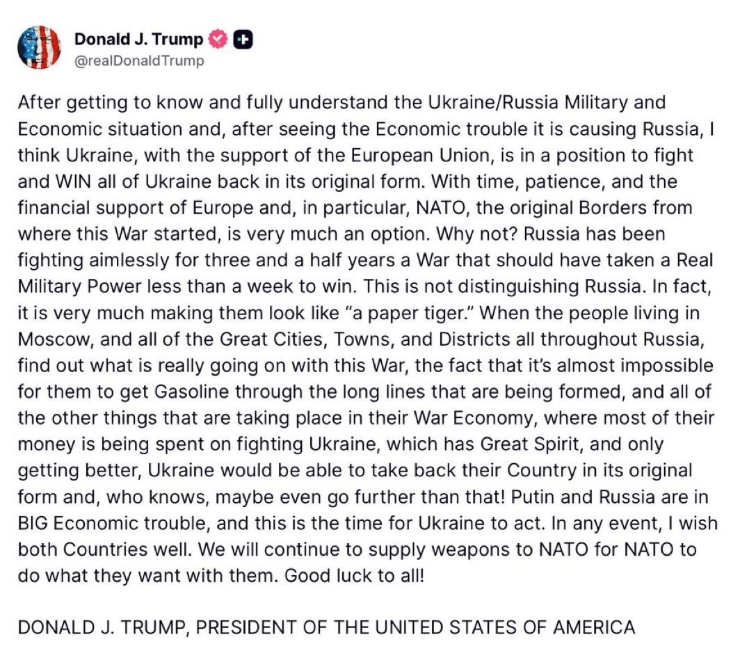 W powyższym oświadczeniu Trump kpi z Rosji jako fałszywej potęgi militarnej i głupio nazywa Rosję "papierowym tygrysem". Dał do zrozumienia, że będzie nadal wspierał ukraińskie ataki dronów na rosyjskie instalacje naftowe i gazowe. Ignoruje to fakt, że Rosja odmówiła użycia swoich największych i najbardziej niszczycielskich systemów broni przeciwko Ukrainie, podczas gdy Putin nalegał na wynegocjowanie ugody z Trumpem, dając mu korzyść z wątpliwości jako uczciwemu pośrednikowi. Szybko przekonuje się, że Trump nie jest bardziej za zakończeniem tej wojny niż Biden, więc być może w najbliższej przyszłości zobaczymy niektóre z tych większych broni użytych przeciwko Ukrainie. Tak, Putin mógłby zakończyć tę wojnę w ciągu tygodnia, gdyby wystrzelił rakiety Oreshnik na Kijów i zaatakował kluczowe instalacje rządowe, a nie tylko infrastrukturę i składy broni. Czy Trump go do tego odzywa?